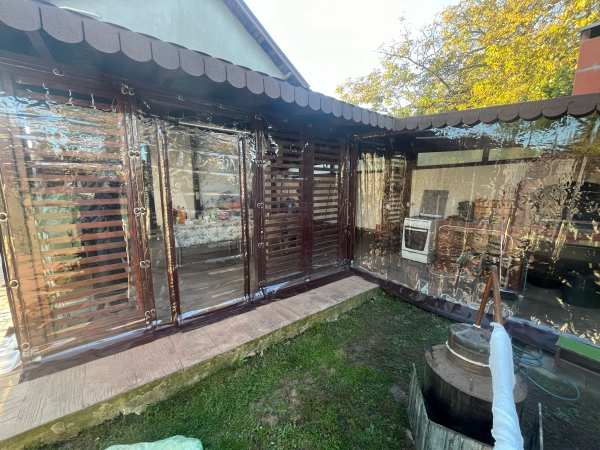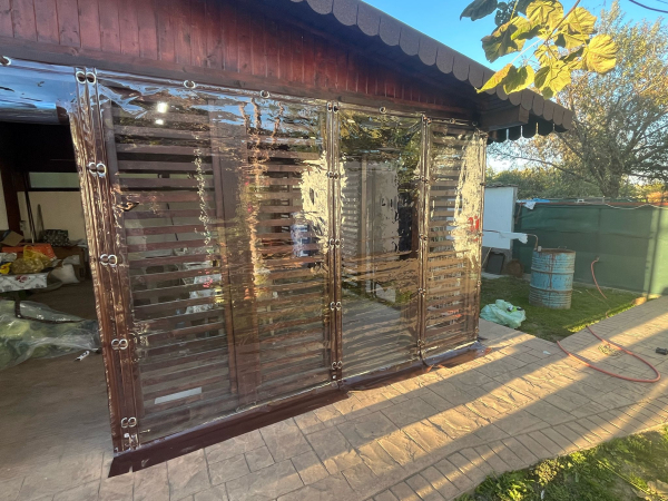 Panoul transparent este realizat din folie cristal cu grosimea de 0,8 mm, tratata UV, rezistenta la temperaturi extreme (-48°C pana la +50°C). Aceasta este croita la dimensiunea necesara, intarita pe margini si prevazuta cu capse ovale montate pe banda de rigidizare (poliplan).